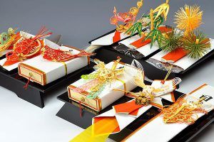 После принятия решения о предстоящей свадьбе происходит традиционный обмен обручальными подарками между семьями жениха и невесты, что у нас происходит после заключения брака. Семье девушки принято дарить девять, семь или пять конвертов. В первом — деньги на проведение свадебной церемонии, которая стоит достаточно дорого. В остальных конвертах ритуальные подарки. Раньше это были: сушеные кальмары, сушеные водоросли, веер, спутанные нитки и бутылочки с саке. Родителям жениха дарят конверт с половиной суммы в знак согласия и понимания.
