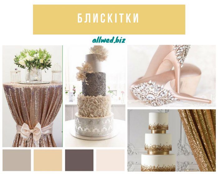 Свіжий і дуже незвичайний тренд — блискітки. Ідеально підходить для весілля в стилі glam (гламур). Які тобі подобаються більше: золоті чи срібні блискітки?