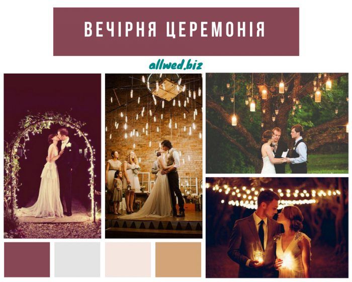 Все більше і більше пар вибирають вечірню церемонію. І це чудово! Якщо ти хочеш, щоб твоя церемонія була неймовірно романтичною і затишною, віддай перевагу саме цьому варіанту. Свічки, вогники гірлянд і його очі навпроти …