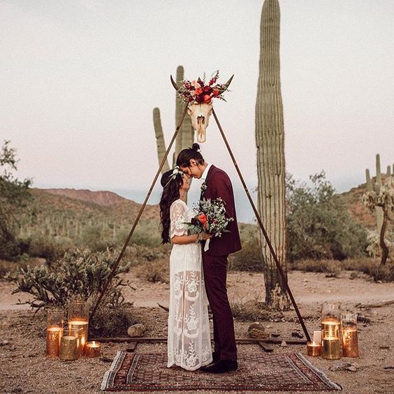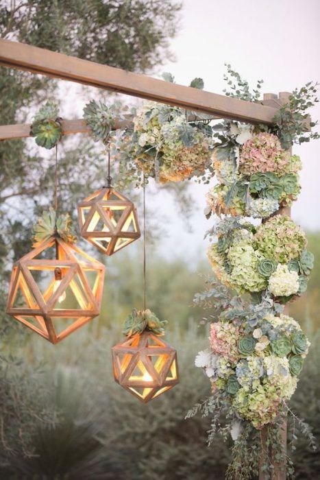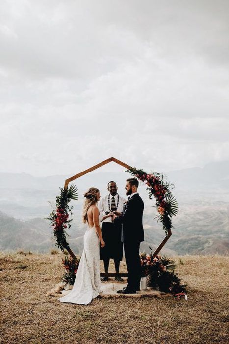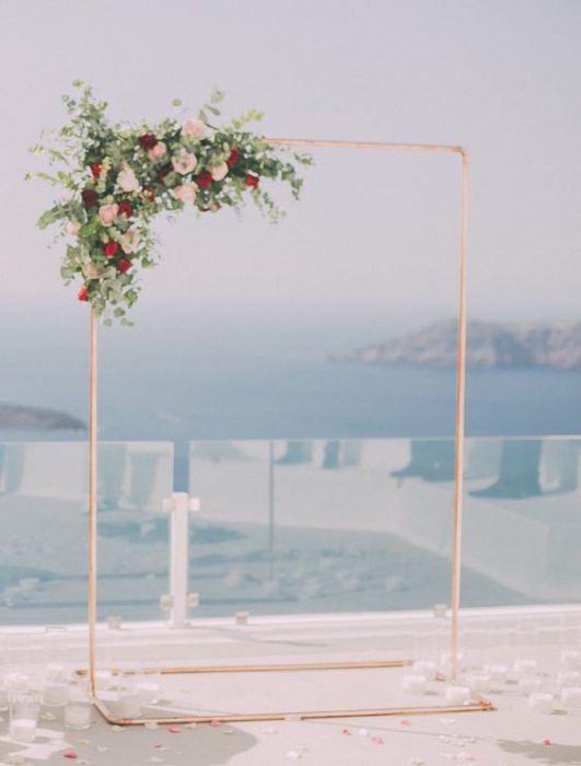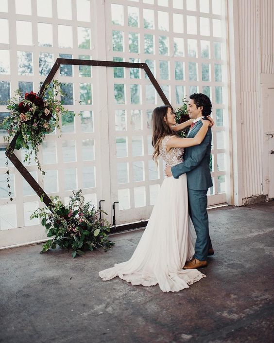 Кстати, если не хотите выкладывать большую сумму из свадебного бюджета за такую оригинальную арку. Можно обычную п-образную украсить геометрическим декором — стильно и более экономно.