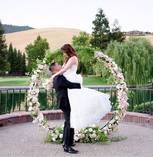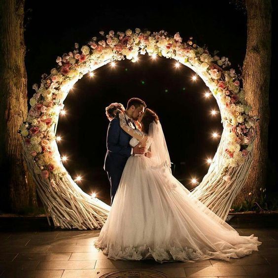 Круглая свадебная арка на фотографиях превращается в уникальную рамку для особенных фотографий молодоженов.