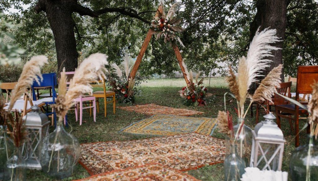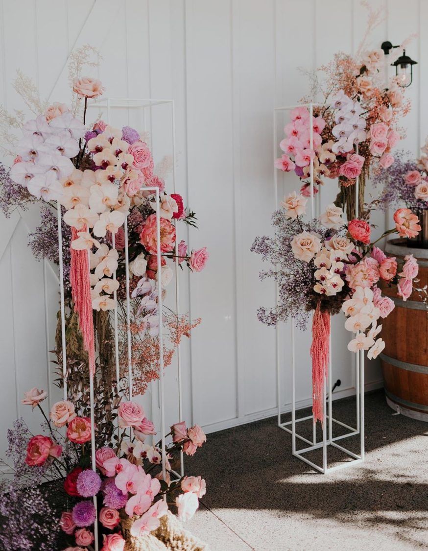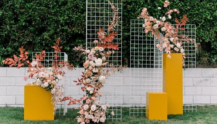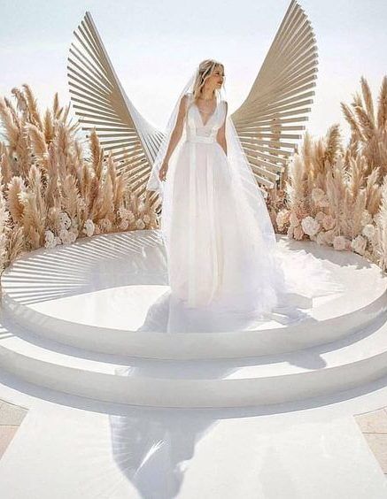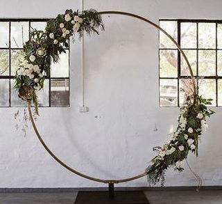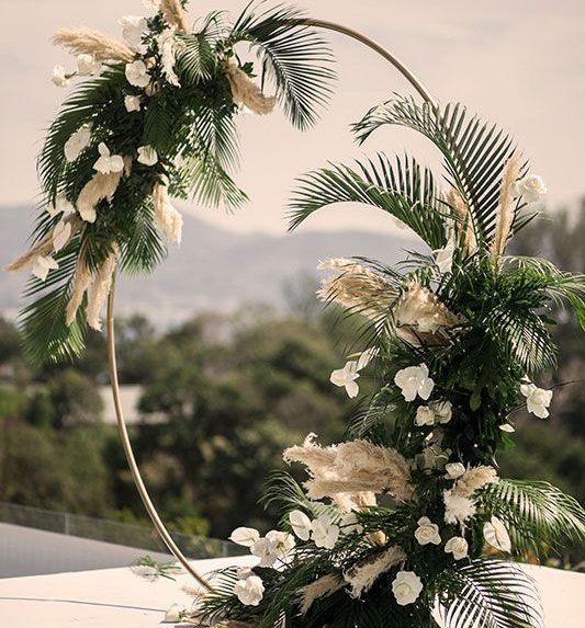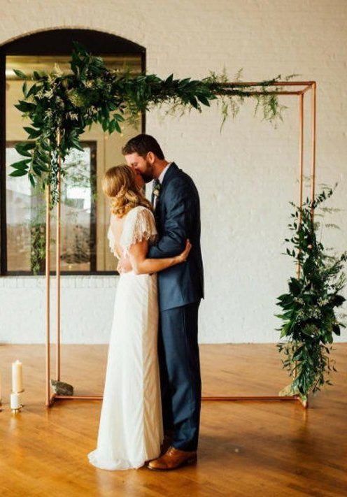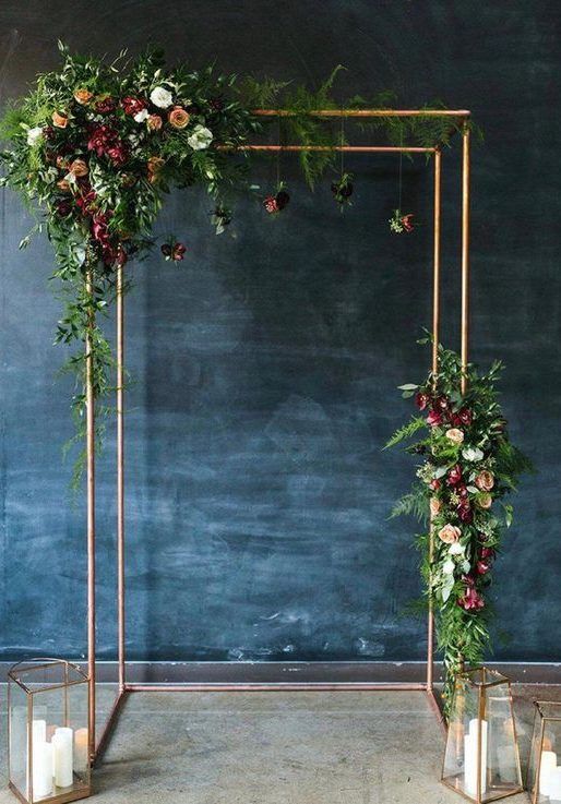 В этом свадебном сезоне сохраняется геометрия. Но теперь свадебные арки геометрической формы более легкие и напоминают рамки, не загроможденные декором. Вокруг них много воздуха, а они сами увиты цветами, зеленью или декорированы пампасной травой.