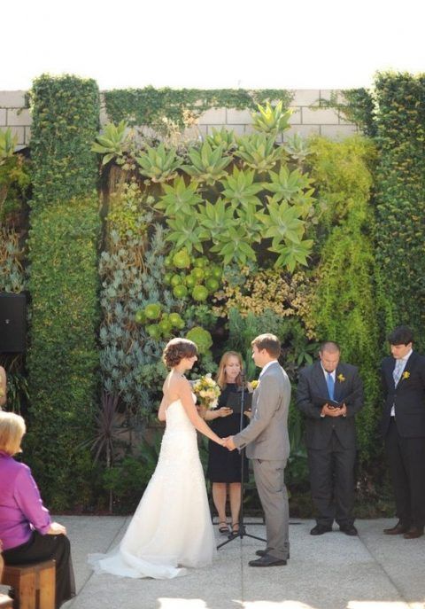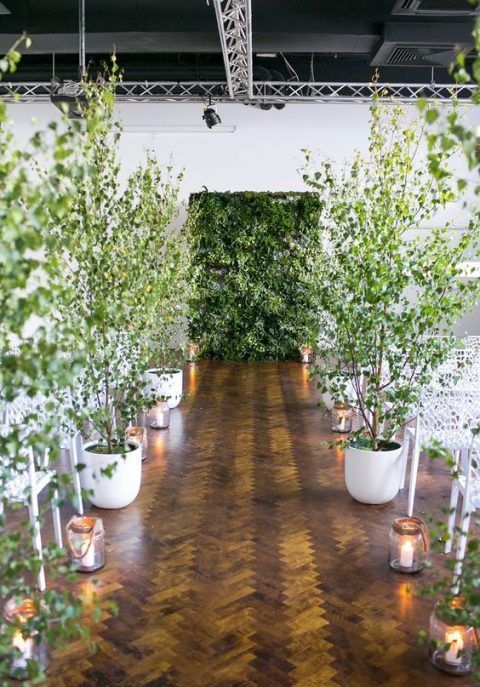 Несколько прошлых сезонов была популярна цветочная стена. Сейчас ей на смену пришла зеленая стена. При этом совсем не обязательно создавать ее искусственно, можно просто выбрать подходящее место для свадебной церемонии.