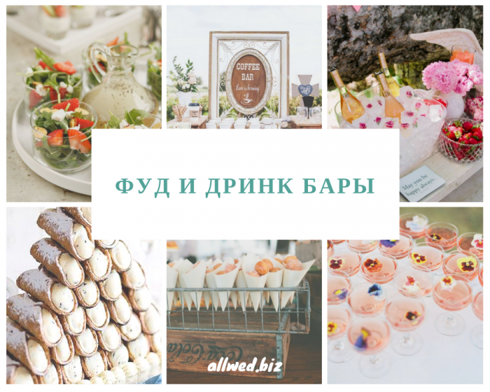 Candy-баром на свадьбе уже никого не удивишь, поэтому с каждым сезоном все популярнее становятся фуд и дринк бары. И чем они необычнее, тем лучше :). Главное — чтобы они отражали ваш вкус (опять привет индивидуальности ;)).