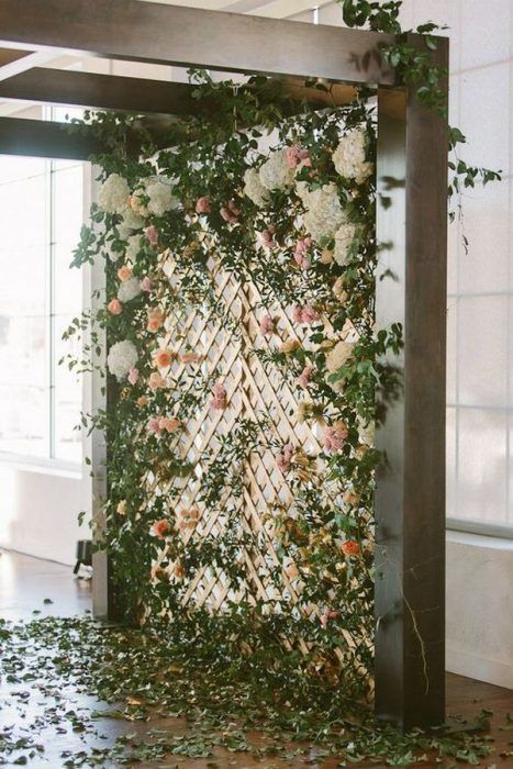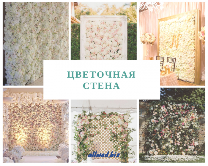 Цветочная стена может использоваться вместо свадебной арки и потом служить фоном для фотосессии. Можете быть уверены, что снимки получатся шикарными!