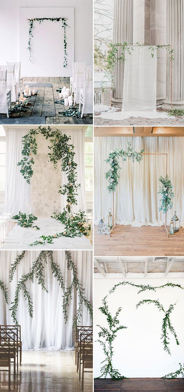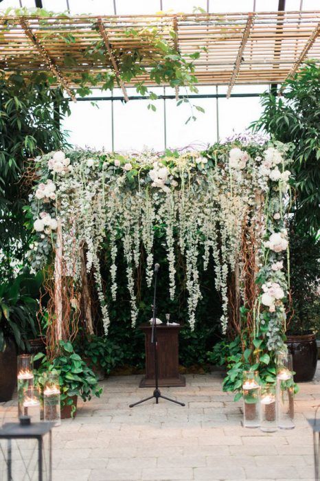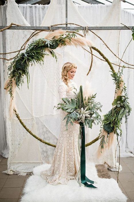 Идеальное оформление для свадьбы 2018 — гибкие ветки винограда или ивы. Дополните их тканью — и получится прекрасная арка для церемонии. Также декораторы в этом году будут активно использовать прием вертикального наслаивания — он придает глубину и торжественность композиции, сохраняя ее минималистический стиль.