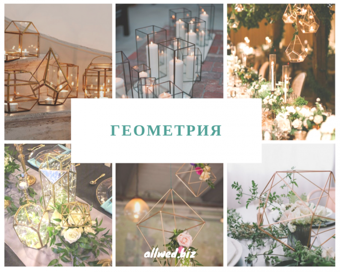 В этом сезоне все чаще встречается геометрия в свадебном декоре. Арки, композиции на столы, полиграфия — везде прослеживается этот тренд.