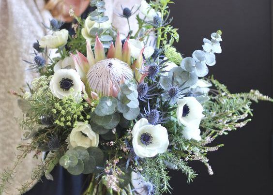 В-третьих, он идеально вписывается в модные сейчас букеты-«растрепыши» и подчеркивает популярную сейчас пыльно-голубую палитру.