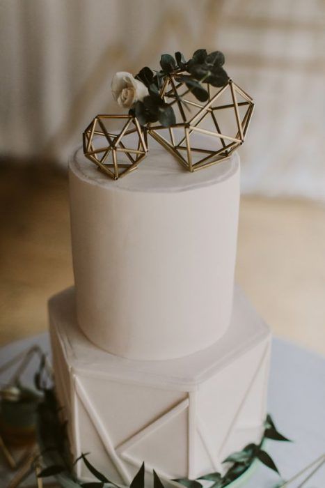 А еще в этом свадебном сезоне торт в стиле минимализм может подчеркивать другие тренды: ботаник (зелень) или геометрию.