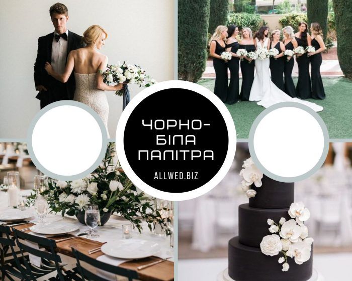 Позачасова чорно-біла весільна палітра теж може бути використана на весіллі 2020. Розкішні вечірні сукні, чоловіки в костюмах або смокінгах — така весільна вечірка буде виглядати дуже витончено.